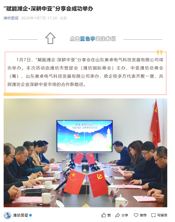2026年1月7日,由濰坊市貿(mào)促會(huì)主辦,山東奧卓電氣科技發(fā)展有限公司承辦的中亞濰坊總商會(huì)“賦能濰企·深耕中亞”分享會(huì)在奧卓科技成功舉辦。本次活動(dòng)匯聚政、校、研、企、會(huì)多方資源,以“賦能濰企,深耕中亞”為主題,共商合作新路徑,共拓出海新機(jī)遇。